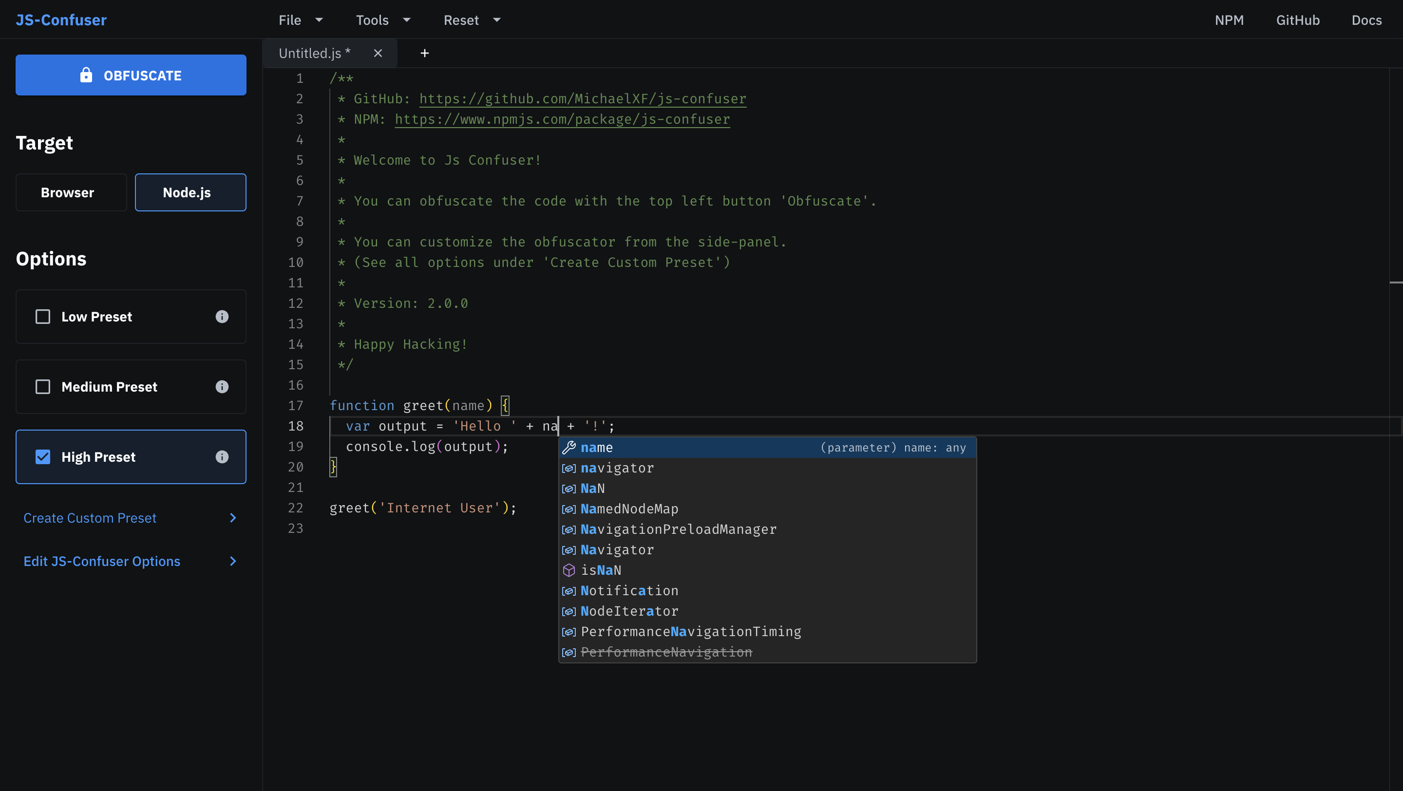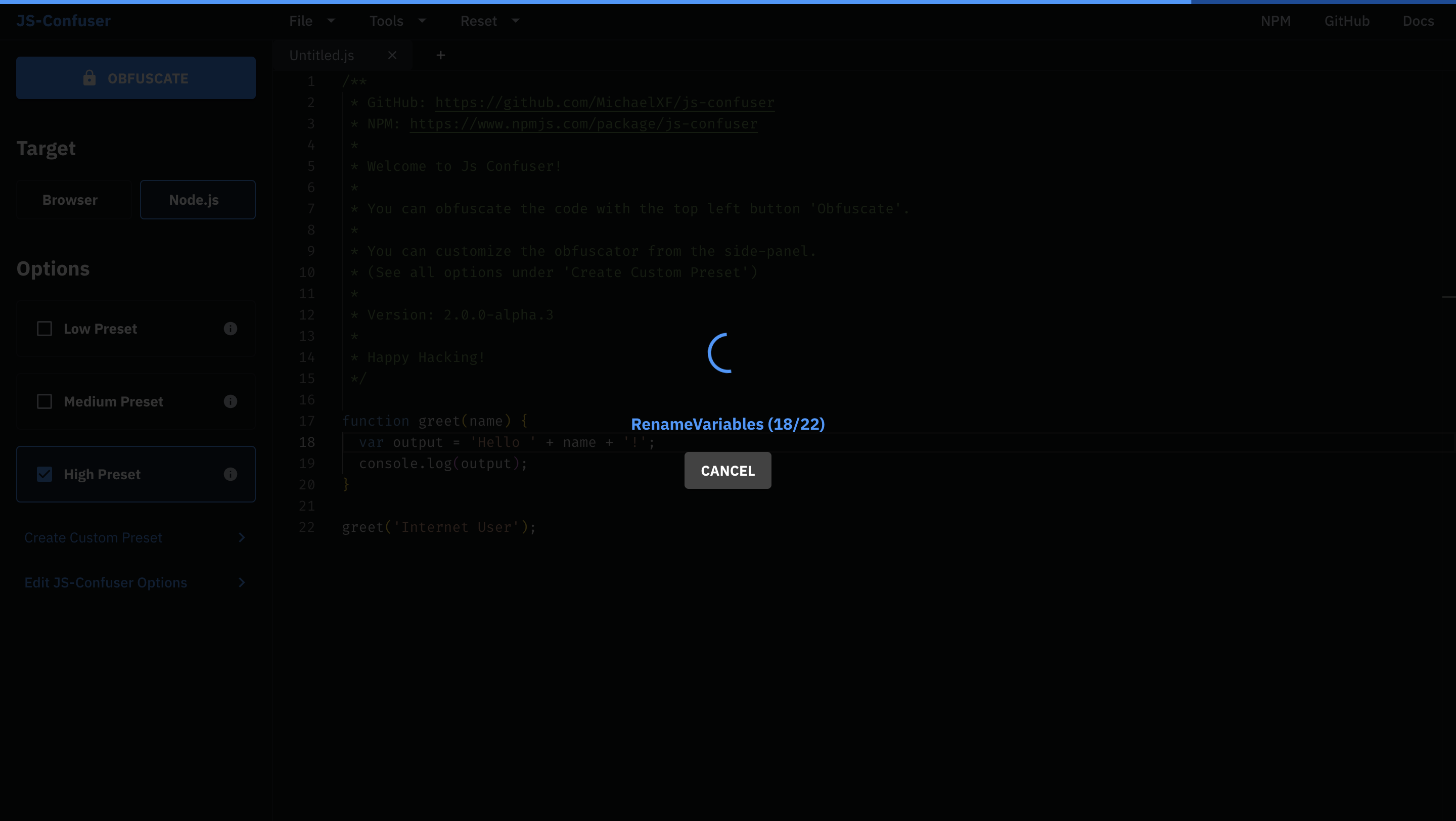 Protect sensitive business logic, your intellectual property, or personal projects with ease using JS-Confuser.