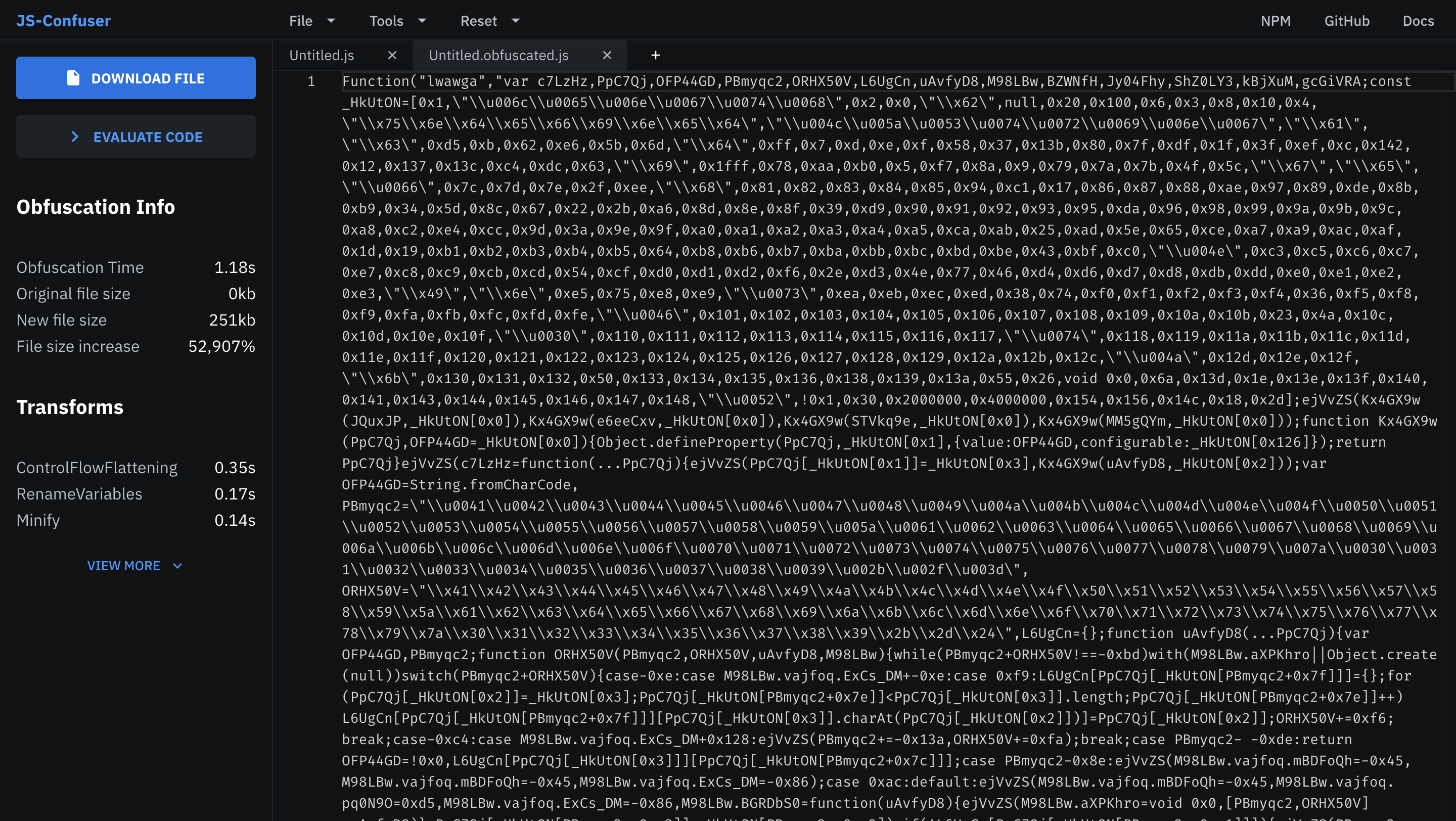 JS-Confuser is a powerful JavaScript obfuscation tool that makes your programs impossible to understand, copy, re-use or modify without authorization.*
