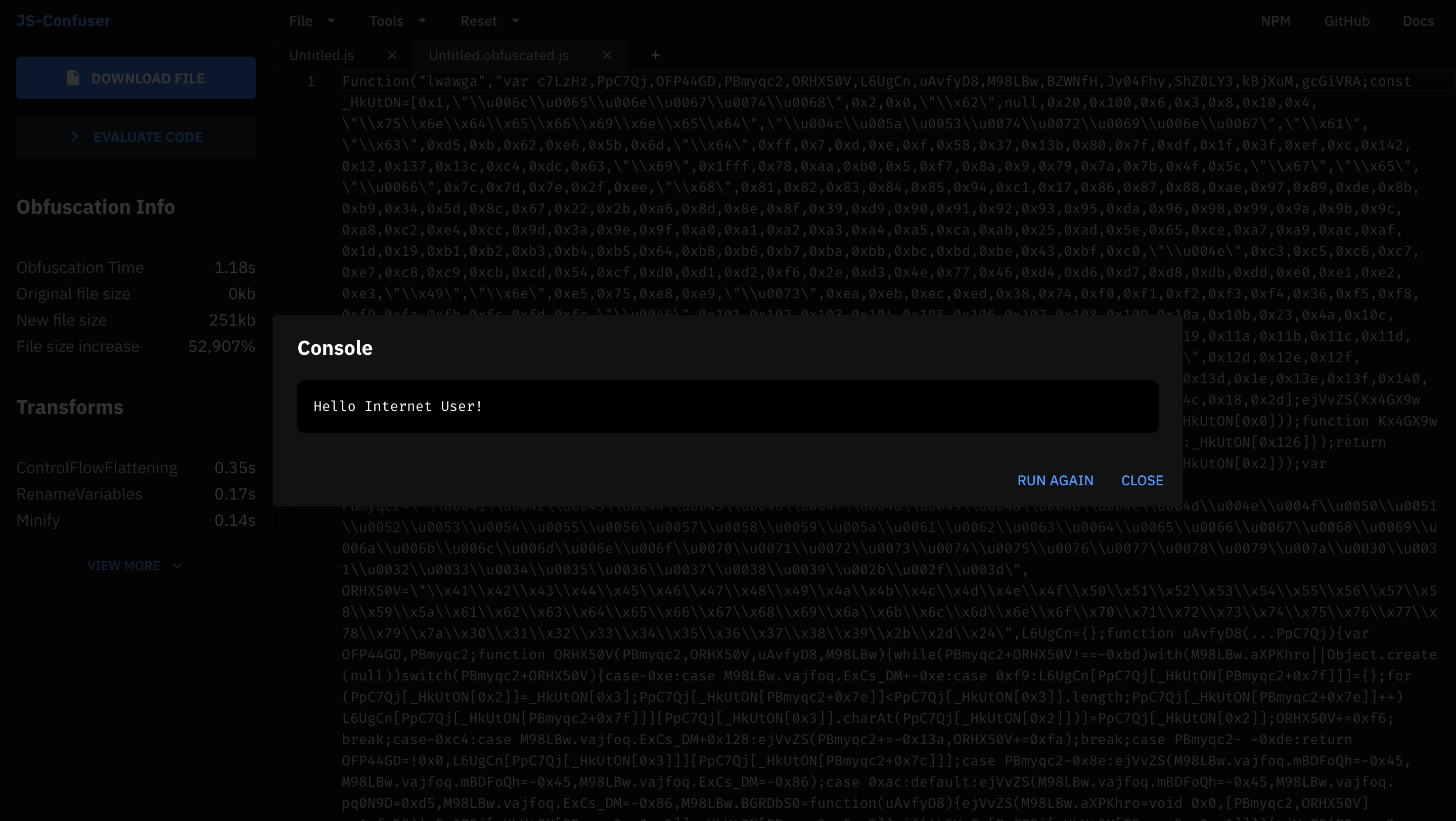 This feature is currently experimental and may not function as expected.JavaScript Obfuscation helps protect your code from being stolen and being reverse engineered. This tool transforms your original JavaScript source code into a new representation that's harder to understand, copy, re-use and modify without authorization. The obfuscated result will have the exact functionality of the original code.